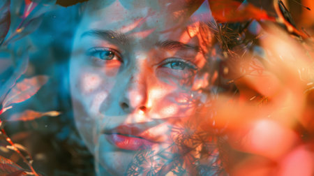 Artistic portrait of a woman surrounded by vibrant shadows of leaves, creating a surreal blend of warm and cool tones.
