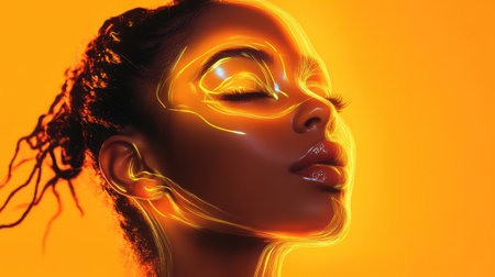 A woman stands with her eyes closed, emanating a radiant glow. Surrounding her features are vibrant lines of light, set against a warm orange background, enhancing her serene expression and energy.