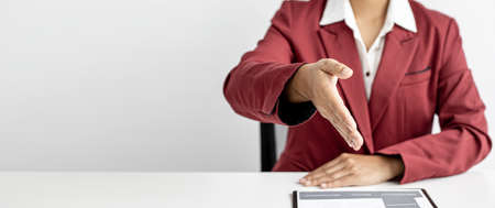 The manager is reaching out to the job applicant after the job interview and is ready to accept the candidate to join the job applicant. Job interview ideas. Panorama banner background with copy space