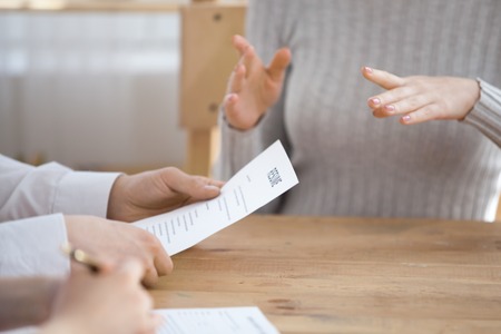 The job applicant is submitting a resume to the manager for a job interview. The concept of a job interview in a position that matches the candidate's qualifications and abilities.