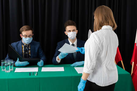 Close-up of unrecognizable candidate sitting at table and applying resume for job through barrier screen