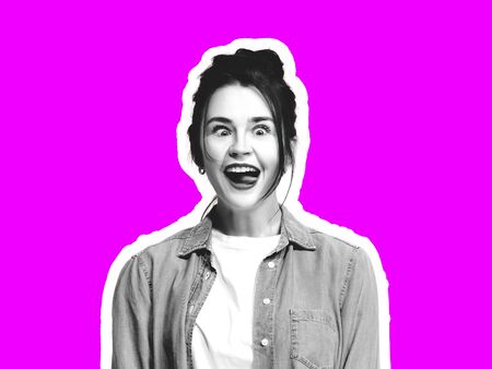 Gremaces. Collage in magazine style with emotional man in black and white contour on bright background with copyspace. Modern design, creative artwork, style and human emotions concept.