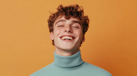 A young man with curly hair and a big smile enjoys a moment in front of a vibrant orange backdrop. He wears a turquoise sweater that enhances his joyful expression.