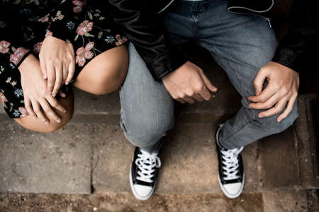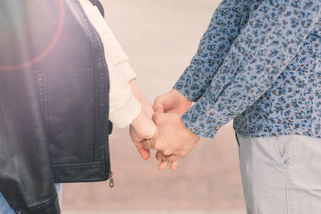 Romantic love couple. Relationship concept. Tender friendship, unrecognizable people together holding hands outdoors