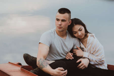Happy multi ethnic couple in casual clothes is together indoors in the studio. Caucasian guy with asian girlfriend.