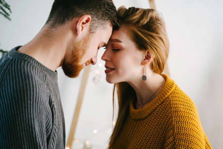 Close Up Portrait Of Young Loving Couple In Nature, Happy Caucasian Man And Woman Sitting Gently Touching Foreheads Closing Their Eyes Against The Background Of Nature