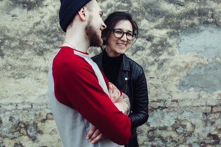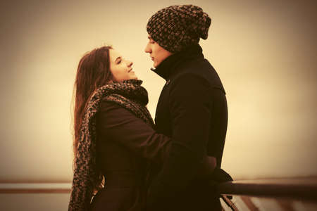 Happy young fashion couple in love embracing outdoor Stylish man and woman wearing classic coats beanie and scarf