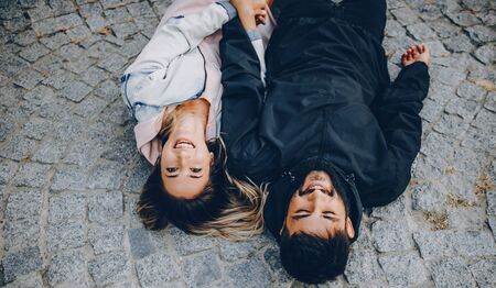 Brunette caucasian couple lying on a stone background and smiling cheerfully