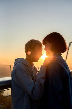 Two women smiling before kiss, Young lesbian couple enjoying romantic moments together at sunrise