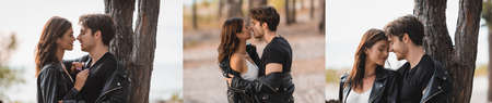 collage of happy young couple holding hands and looking at each other while enjoying coffee in park