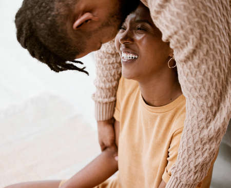 Young happy couple, international relationship. Black man and white woman smiling and talking, home leisure, family life concept