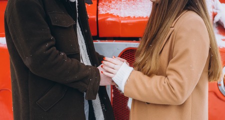 Multinational beautiful joyful couple smiling and warming their hands at city street