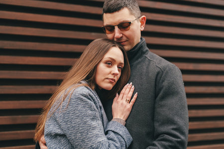 Couple sharing a warm embrace against a wooden backdrop on a cool day in a city setting