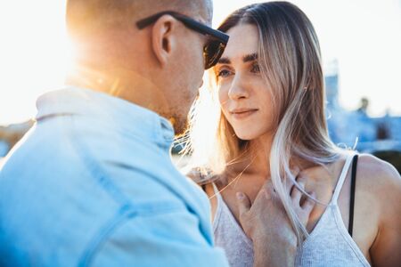 Close-up of faces romantic couple will kiss each other while at beach at sunset. couple, love, beach, romantic, summer, lifestyle concept.