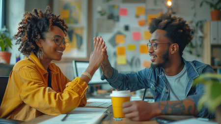 Caucasian adults high-fiving in front of colorful sticky note wall