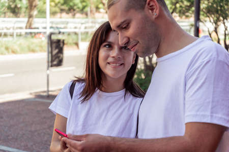 Portrait of young couple sit on a park bench and look at photos on a smartphone