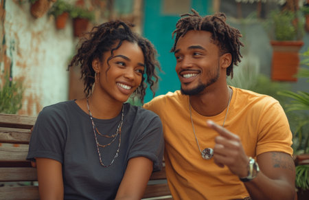 A joyful young Black couple sitting on a wooden bench in a lush garden, happily conversing and pointing
