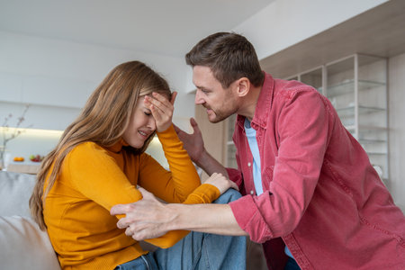A woman beaten by her husband standing behind her and looking at her aggressively. Domestic violence.