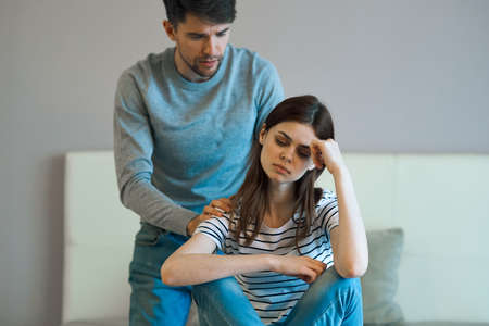 Displeased young man sitting on couch in front of his stressed wife touching head and looking at her during argument