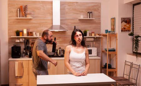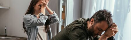 Selective focus of crying woman with alcohol addicted husband on kitchen, panoramic shot