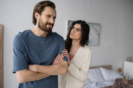 Displeased man crossing arms near blurred brunette girlfriend in bedroom