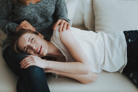 Upset Young Daughter Lying on Legs of Mother on Sofa. Relationship in Family. Worried Mother. Psychological Help. Unhappy Girl. Support Concept. Scared Person. Women on White Sofa.