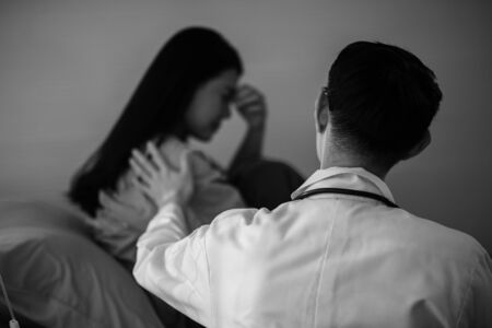Female Psychologist, friend or family sitting and put hands on the shoulder for cheer up to mental depress man, Psychologist provides mental aid to the patient. PTSD Mental health concept