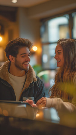 A couple shares a heartfelt conversation in a cozy coffee shop, their intimacy palpable The image captures deep engagement, empathy, and active listening, showcasing a strong, communicative relationship Trust and affection radiate as they enjoy their date, highlighting the beauty of meaningful human interaction This scene embodies true connection AI Generative
