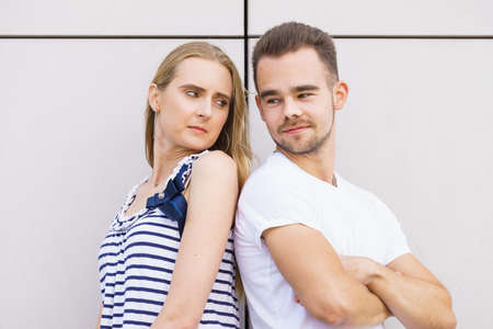 Date and love concept. Young woman and man standing back to back. Outdoors portrait.