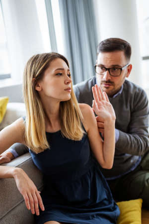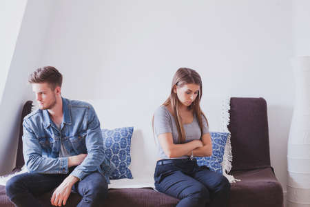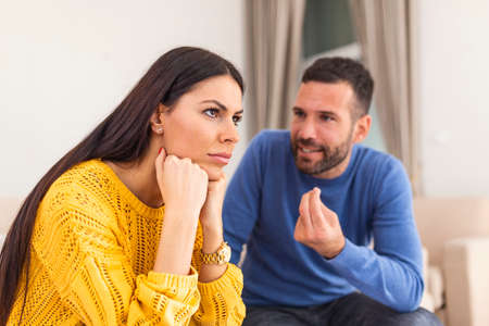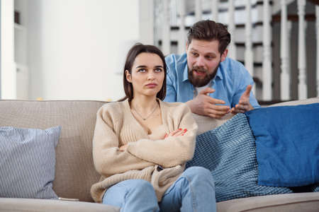Frustrated young couple sitting on the couch and quarreling with each other at home. Physical aggression concept. High quality photo