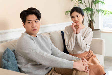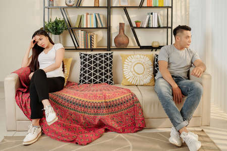 Asian boyfriend and girlfriend sitting on both sides of sofa after having argument