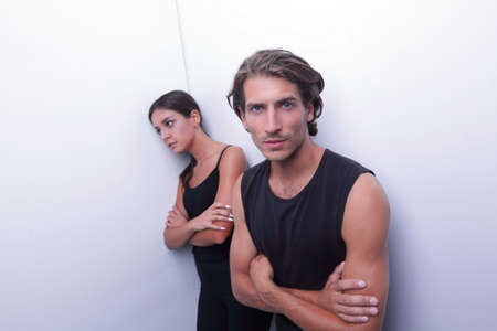 sad couple standing near a white wall.