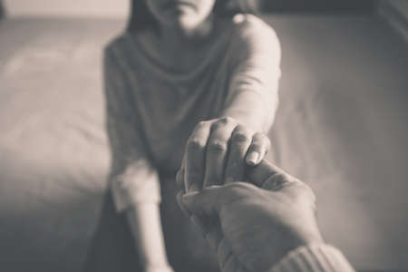Meantal health care concept,Man giving hand to depressed woman,Black and white toned