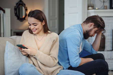 Young wife uses smartphone while sitting on sofa and her husband feels upset behind she. Problems in the family due to addiction to the smartphone.