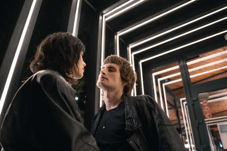 Young beautiful couple in the street. Action. Man and woman looking at each other with their eyes full of love on a black brick wall background, romantic relationships concept.