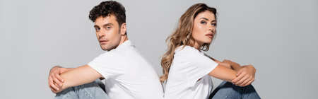young couple in white t-shirts and jeans posing back to back isolated on gray, banner