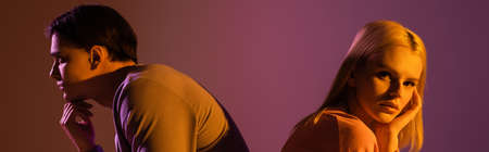 Blonde woman looking at camera near boyfriend on purple background with lighting, banner