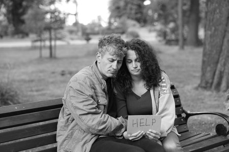 Homeless people with sign Help on bench in park. Black and white effect
