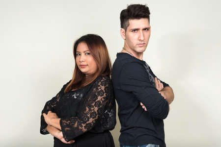 Portrait of overweight Asian businesswoman and young man as couple together