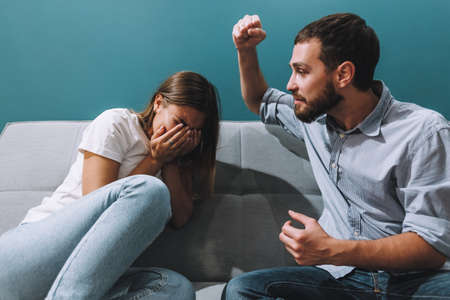 Aggressive caucasian wife Shouting At Unhappy Victimized Husband Sitting On Couch At Home. Family Conflicts, Quarrels And Domestic Violence, Marriage And Relationship Crisis Concept. Selective Focus