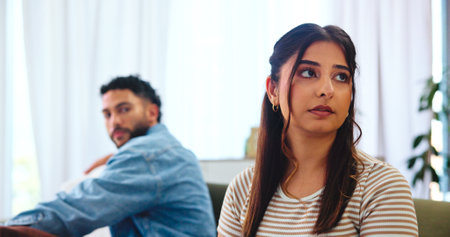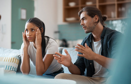 Mixed race female upset with boyfriend while fighting on the sofa in apartment.