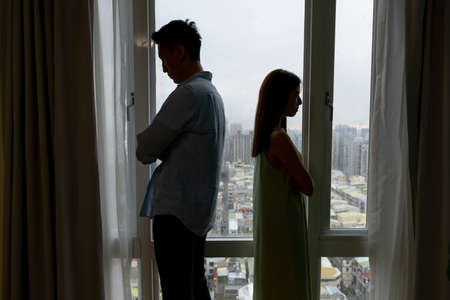 silhoutte of asian couple has a serious argue in front of the window at home - they turn around face another side against each other
