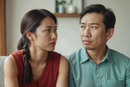 Angry Asian couple at living room, divorce, conflict in the family