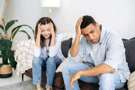 Quarrel, resentment against each other. Annoyed sad spouses, a multiracial couple, are sitting on a sofa in the living room, offended by each other after a showdown and shouting