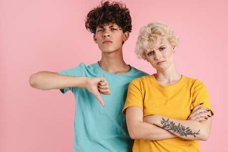 Upset couple standing over isolated pink background showing dislike with thumbs down, rejection concept