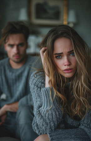 A woman sits on the couch with her head in her hands, sad and depressed, beside an angry man
