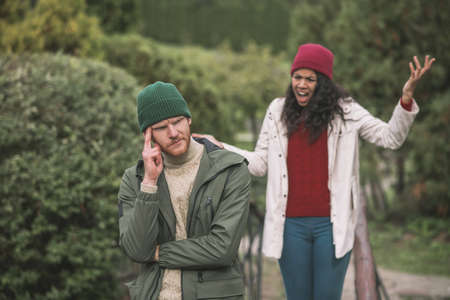relationship problems in young family, angry woman wife and tired indifferent man husband