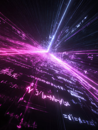 Light beams illuminate mathematical equations reflecting on a sleek floor, creating a striking visual in a contemporary space at night.