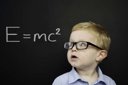 Smart young boy wearing a blue shirt and glasses stood in front of a blackboard with E=mc2 written in chalk