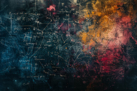 An abstract background featuring a chalkboard with complex mathematical equations written in chalk